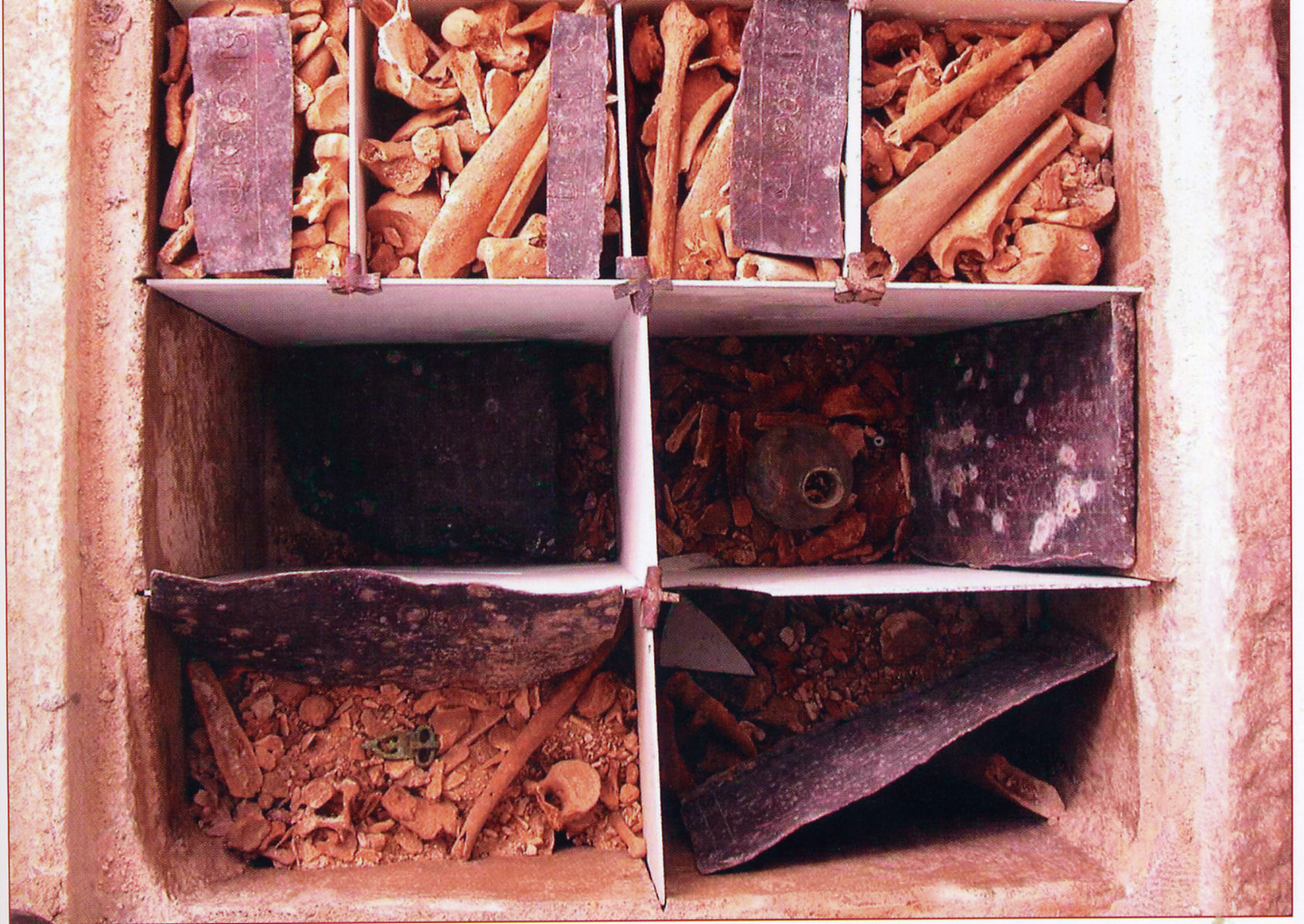 S. GAVINO M. - Un'ampolla di vetro vuota intera e piccoli frammenti di un'altra ampolla sempre di vetro - Porzione di perone sinistro (3/4 distali) - Epifisi distale del perone destro - Porzione distale di tibia sinistra quasi intatta - Porzione di omero destro con la testa quasi intatta - Porzione inferiore di omero destro con epifisi distale riconoscibile - Due frammenti di testa di femore - Calcagno sinistro - Quattro vertebre dorsali con erosione delle apofisi spinose e trasversali. - Tre vertebre lombari - Diversi frammenti di altre vertebre - Astragalo sinistro - Primo metatarso - Quattro ossa del tarso - Tre metacarpi - Falange prossimale dell'alluce - Frammenti di altre falangi - Frammento di osso sacro, porzione distale con visibili i fori sacrali - Numerosi frammenti di coste - Frammento dell'estremità distale del radio sinistro - Estremità distale della diafisi del radio - Estremità distale dell'ulna - Due frammenti verosimilmente dello stesso astragalo - Porzione olecranica di ulna destra - Frammento di capitello radiale - Frammento di osso della scatola cranica, privo del tavolato esterno - Frammento dell'angolo mandibolare sinistro - Numerosi frammenti ossei non attribuibili
